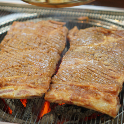 돼지갈비가 두툼하고 양념이 감칠맛 있어 맛있었습니다. 고기를 잘 구워줘 편하게 먹을 수 있어 좋았어요.