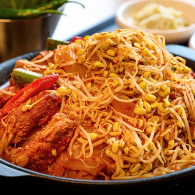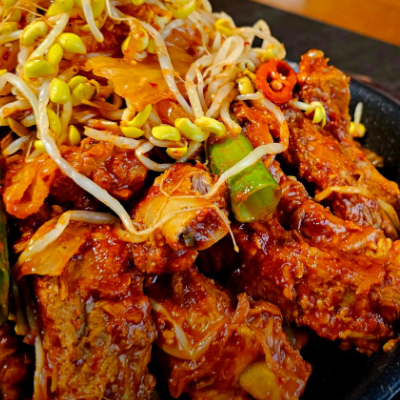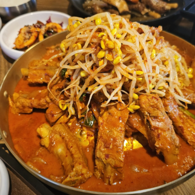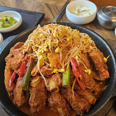 등갈비에 묵은지김치 콩나물 들어가서 맛있어요. 국물이 어느정도 있는데 밥에 비벼먹기 좋아요. 등갈비 부드럽고 양념맛이 끝내줘요.