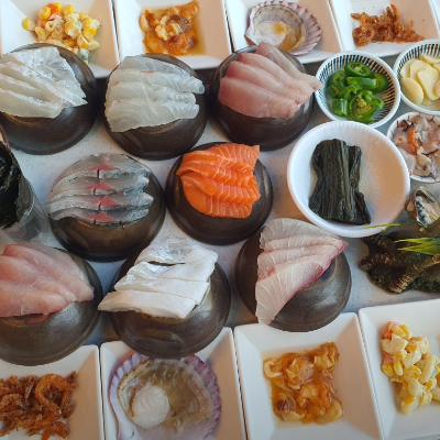 에메랄드빛 파도가 넘실대는 함덕해변뷰를 바라보며 신선한 딱새우와 고등어회를 풍성하게 맛 볼 수 있는 횟집입니다.
