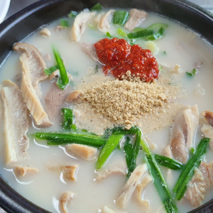 뽀얗고 담백한 국물에 함께 제공되는 부추와 소면을 넣어 먹는 전통 돼지국밥 입니다.