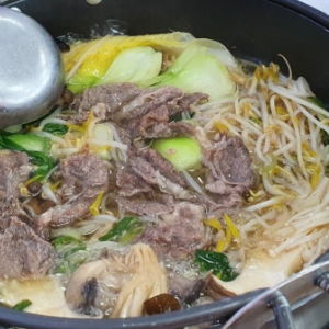 맑고 깔끔한 국물에 쫀득쫀득한 소머릿고기와 당면이 포함된 개운한 국밥입니다. 소면.부추가 필요하시면 직원에게 요청 가능합니다.