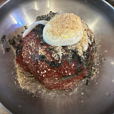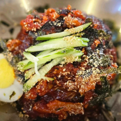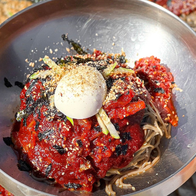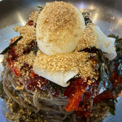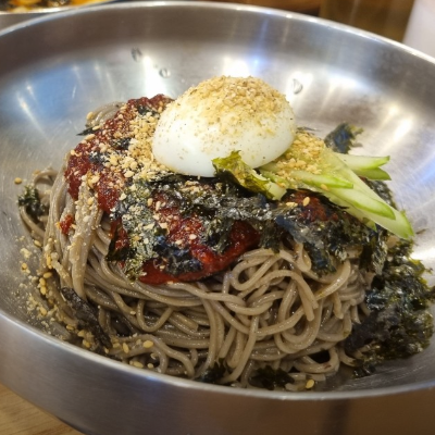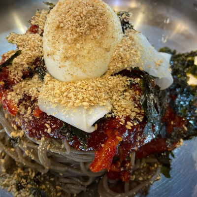 명태회양도 많이 들어간 비빔양념에 김가루.통깨 가득이라 고소함도 굿입니다. 메밀국수 면발도 쫄깃합니다.