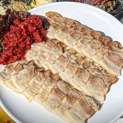 같이 나오는 열무김치가 맛있어요. 밑반찬들도 괜찮구 수육도 막국수도 다 기본적인 맛있는 맛입니다.