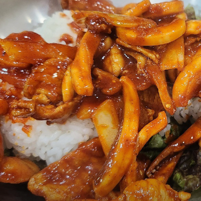 오삼제육의 불맛이 그대로 살아있고 아주 쓱쓱 비벼 먹으면 한공기 뚝딱할 수 있습니다.