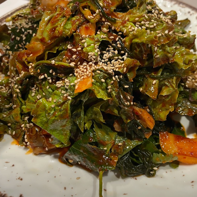 누룽지 백숙을 갓김치와 깻잎과 와사비에 함께 먹으면 맛있어요.