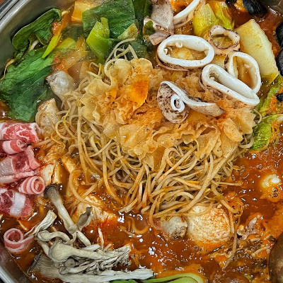 짬뽕전골인지 매운백숙과 같은 느낌의 퓨전 짬뽕인거 같아요. 샤브샤브처럼 각종 야채, 버섯, 숙주로 건더기를 먹는 재미도 쏠쏠합니다.