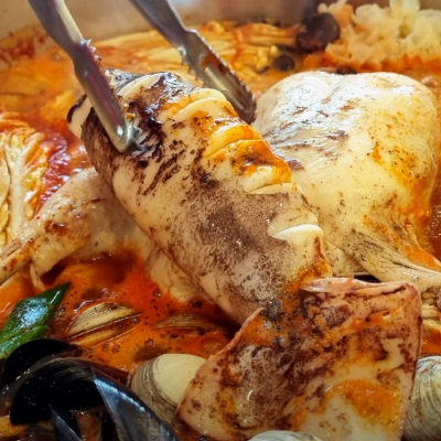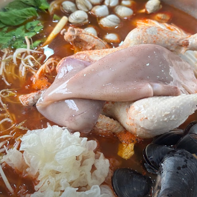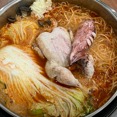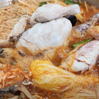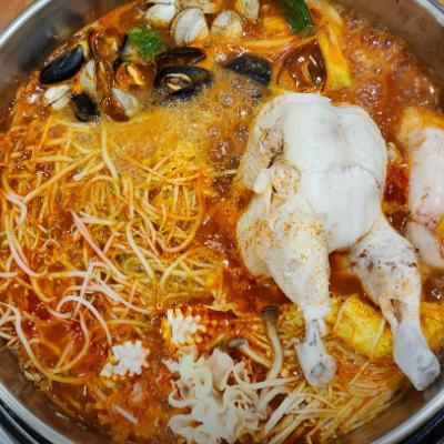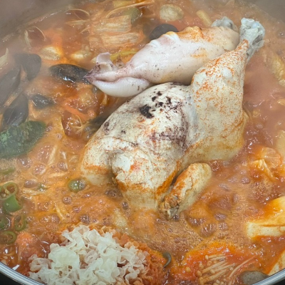 냄비에 커다란닭이 한마리 딱 있어서 너무 놀랬습니다. 안에 들어가는 해산물도 너무 많았고 해산물러버로써 너무 행복한 저녁식사였습니다.