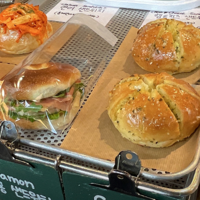 평일 오후 2시쯤 방문했는데 기본 베이글 다 팔리고 어니언 마요, 갈릭퐁당, 코끼리 샌드위치만 구매했어요. 빵피가 부드럽고 쫄깃쫄깃해서 맛있어요.