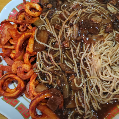 당진으로 노지캠핑 갔다가 근처 서유기짬뽕 들렀어요. 오징어 볶음이 같이 나오는 쟁반짜장입니다.