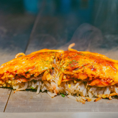 오사카 스타일과 달리 재료를 섞지 않고 층층이 쌓아 올린 히로시마 오코노미야끼예요.