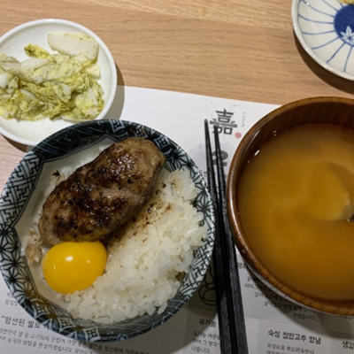 일본식 함박은 처음인데 엄청 부드럽고 맛있네요. 소스랑 양념 국 뭐하나 빠짐없이 다 잘어울리고 계란 노른자에 간장 뿌려 비벼 먹으니 더 맛있어요.