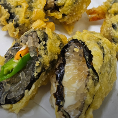 김말이 안에 야채나 치즈, 새우가 들어있기도 하고 안에 당면이 적절한 양이 들어가있어서 겉바속촉 엄청 맛있습니다.