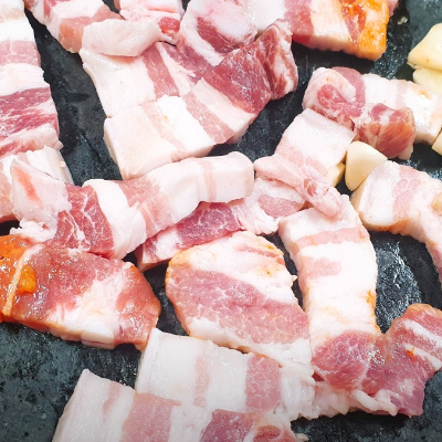 삼겹살을 돌판위에 올려 일단 굽기 시작 했어요. 삼겹살이 익어가는 동안에 뒤늦게 나온 반찬을 조금 먹었어요.