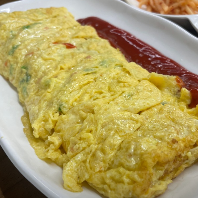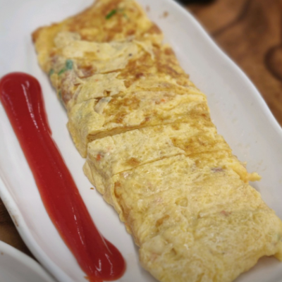 계란말이에 계란만 들어가있는 것이 아니라 여러가지 야채가 들어가있었고 케첩에 찍어먹으면 맛있었어요.