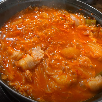 김치찌개 달달하고 부드러운 김치맛이 특징입니다. 1/3 남았을 때 김치국물 더 부어서 라면사리 넣어 먹으면 완성이 됩니다.