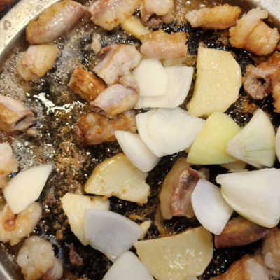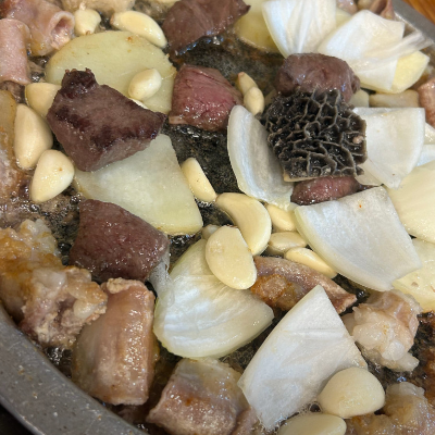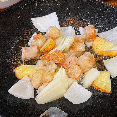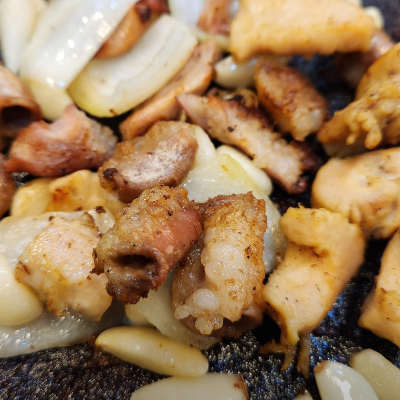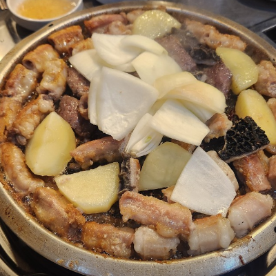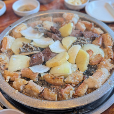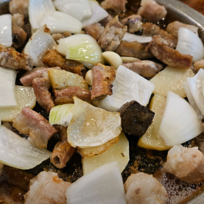 가운데 기름 옴푹 모여있는 곳에 튀겨 먹었네요. 직접 잘 구워 주시고~ 애벌로 삶아서 나와서 먹기 좋아요.