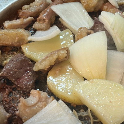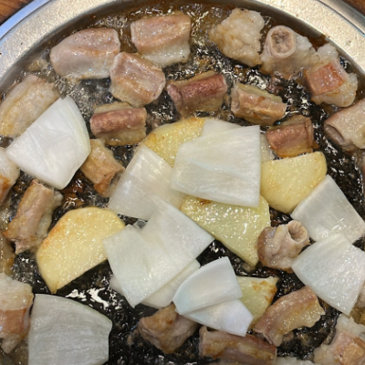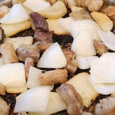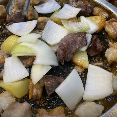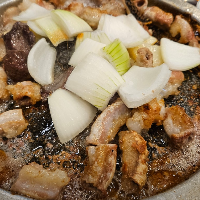 가운데 기름 옴푹 모여있는 곳에 튀겨 먹었네요. 직접 잘 구워 주시고~ 애벌로 삶아서 나와서 먹기 좋아요.