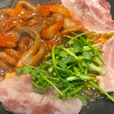 저희 육전+ 미나리삼겹쭈꾸미2인 세트 먹었는데 미나리 향이 좋아서 더 감칠맛있게 잘 먹었어요.