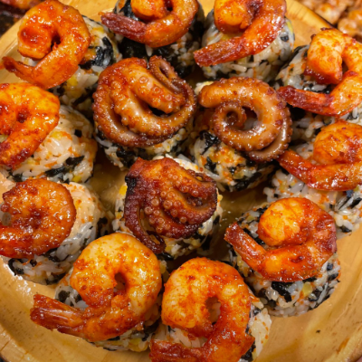 대창이랑 쭈꾸미랑 깻잎에 한번, 주먹밥이랑 한번! 먹으면 너무너무 맛있고, 조금 매우면 계란찜 먹어주면 됩니다.