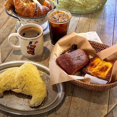 카페에 머무르는 동안 갓 구운 크루아상과 향긋한 버터 냄새로 정신을 혼미하게 만듭니다.