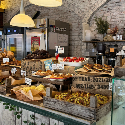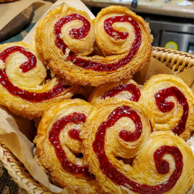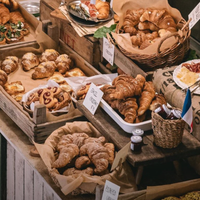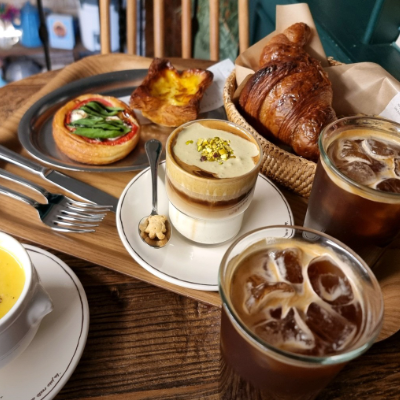 카페에 머무르는 동안 갓 구운 크루아상과 향긋한 버터 냄새로 정신을 혼미하게 만듭니다.