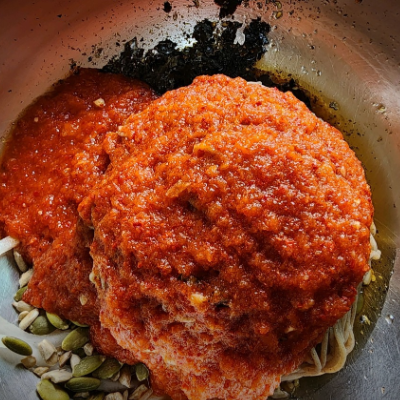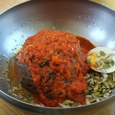 호박씨랑 해바라기씨 같은 견과류가 들어있어서 고소했어요. 밀 식감이 살아있고 빙수처럼 수북이 쌓인 맵지않은 비빔장이 잘 어울어 집니다.