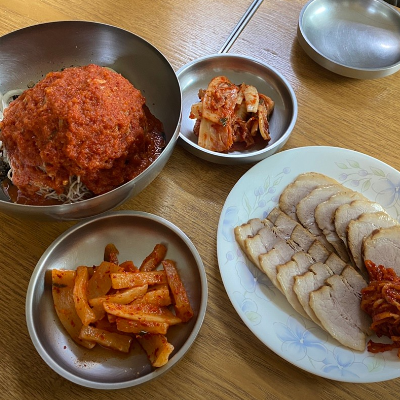 비빔막국수 수육 맛있어요. 비빔국수에 견과류 들어있는게 고소하고 좋아요.