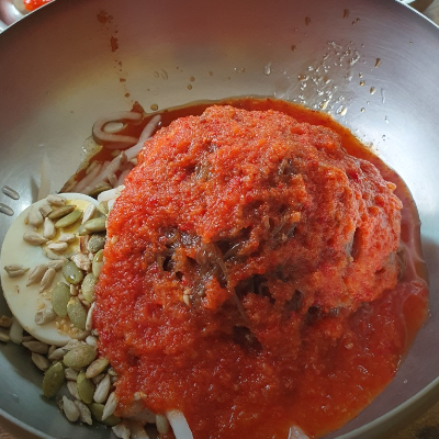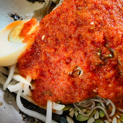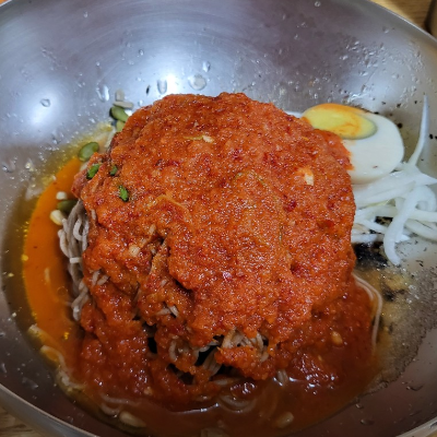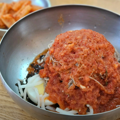 호박씨랑 해바라기씨 같은 견과류가 들어있어서 고소했어요. 밀 식감이 살아있고 빙수처럼 수북이 쌓인 맵지않은 비빔장이 잘 어울어 집니다.