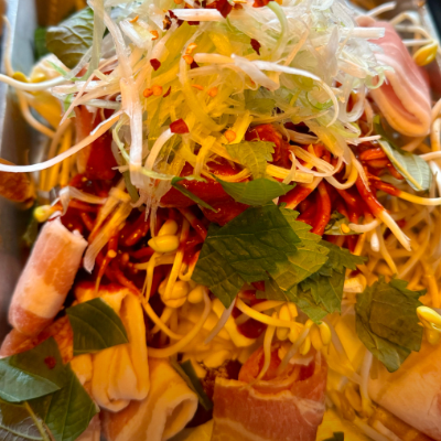 산장오겹수육 주꾸미미나리해물전 김치말이국수 살얼음막걸리 주문했고 오겹수육은 비주얼부터 아주 좋았어요.