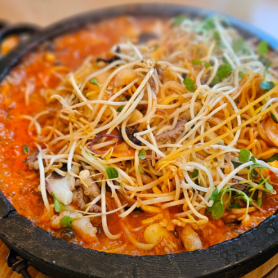 11시오픈부터 손님들이 진짜 많아요. 큰돌판에 야채랑 해산물가득해요. 양이 엄청 많아요. 면이랑 밑에 밥까지 짱이예요.