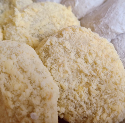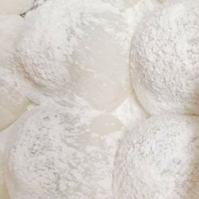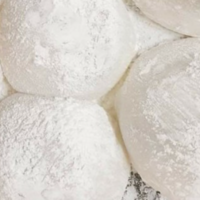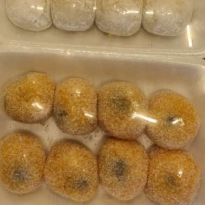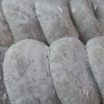 찹쌀떡은 한팩에 10개 들어있어요. 전분가루 옷을 곱게 입은 찹쌀떡은 기계로 만든게 아니다보니 크기가 조금 들쭉날쭉해요.