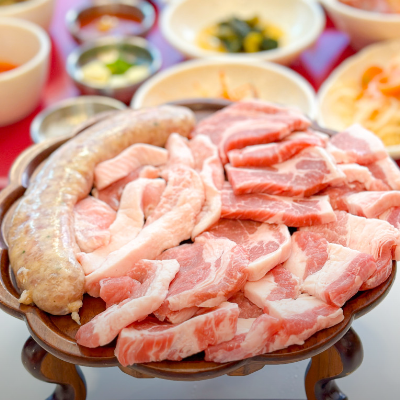삼겹살, 목살, 항정살,주걱살에 한돈으로 만든 수제 소세지까지 구성되어 예쁜 호족반에 올려나와 대접받는 기분이 들어요.