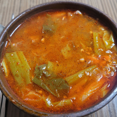 맵거나 짜지 않고 국물이 푹 끓인 소고기국 처럼 구수합니다. 처음에는 그대로 건더기와 국물 먹어보고 다진 마늘, 후추를 첨가하여 기호에 맞게 넣어 먹으면 됩니다.