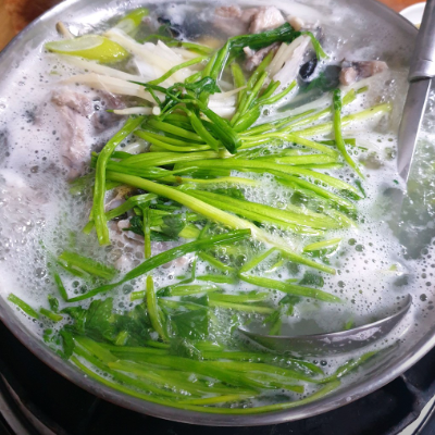 보글보글 끓는 고니에 소금 솔솔 뿌려서 한입 먹고 공기밥에 석석 비벼서도 한입 먹었어요. 감자조림, 복껍질 미나리 무침, 배추김치 밑반찬도 끝내줍니다.