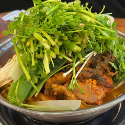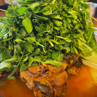 감자탕에 미나리가 이렇게 잘어울릴줄 몰랐어요. 보통의 감자탕이 걸쭉하다면, 미나리 감자탕은 깔끔한 맛이예요.