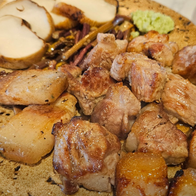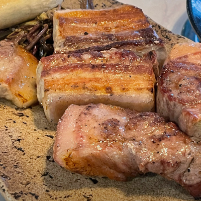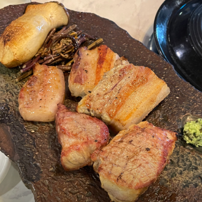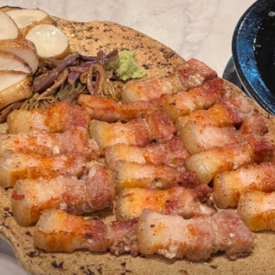 사장님이 직접 구워주시는 흑돼지입니다. 제주를 본뜬 특수제작 접시에 담겨 더더욱 눈호강도 있고 맛도 있어요.