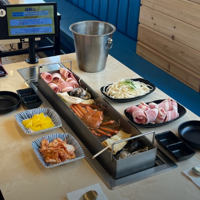 매장이 엄청 넓어서 쾌적해요. 해산물도 다양하고 고기도 있고 칼국수까지 완벽하네요. 양도 보기보다 많아서 다 먹고 나니 배불러요.