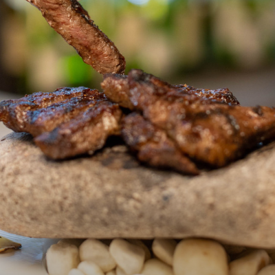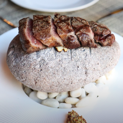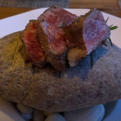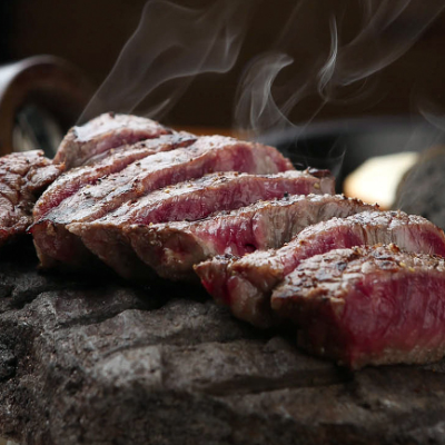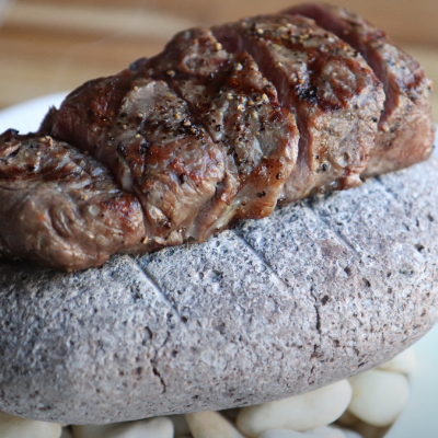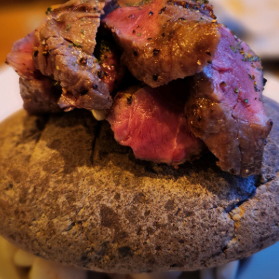 달궈진 돌 위에 구워먹는 한우1등급 등심스테이크는 입안에 살살 녹고 맛이 끝내줍니다.