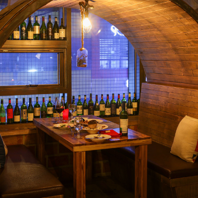 입구부터 즐비한 와인이 눈길을 사로 잡습니다. 내부의 오크통으로 만든 인테리어가 특별한 분위기를 연출해주네요.