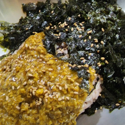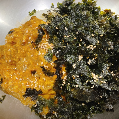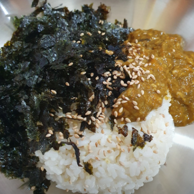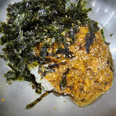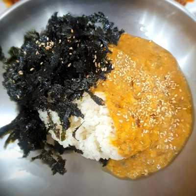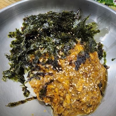 살을 올리고 김가루를 뿌려 참기름 넣어 비벼 먹었어요.