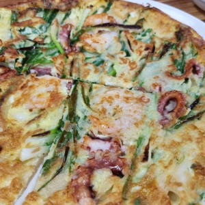 낙지집에서만 맛 볼 수 있는 통통한 낙지가 듬뿍 들어간 파전입니다.