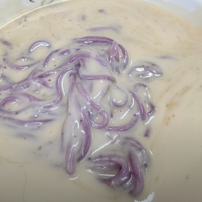 노랑콩물 완전 진하고 맛있어요. 겨울에 먹는 콩국수 별미에요. 설탕 넣어 먹는것도 첨인데 맛있어요.