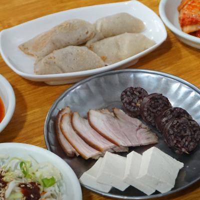 밑반찬으로 나오는 두부와 순대 족발까지! 반찬 퀄리티가 진짜 좋아요. 빙떡이나 다른 반찬들도 정말 맛있네요.