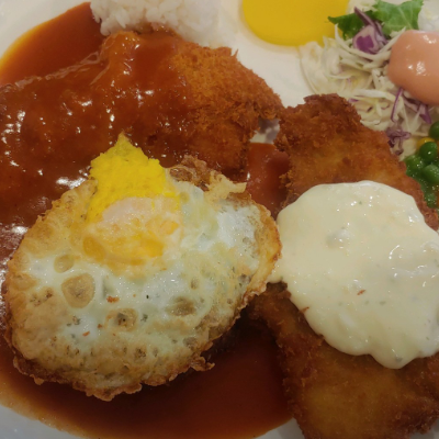 옛날 경양식처럼 정식 메가 있어요 돈가스랑 함박 생선가스입니다. 아이랑 나눠먹었는데도 배부르네요.