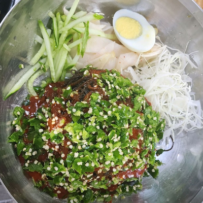 오징어무침 간이 딱 맛있고~ 세숫대야 크기의 냉면도 집 가까우면 자주 먹을 정도로 맛있네요.