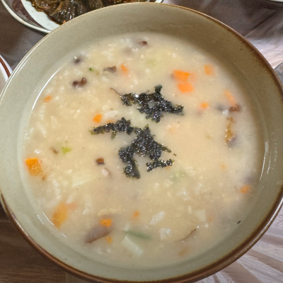 마무리 백합죽~ 여기에 아까 남은 백합탕 국물 한수저 더 떠 넣어서 반찬하고 먹으면 최고의 마무리였습니다.