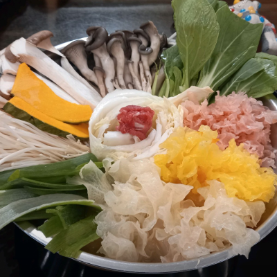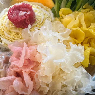 건강하고 신선한 메뉴를 찾는다면 바로 여기이빈다. 비트로 물들인 3색 은이버섯, 담백질 가득한 소고기, 팽이버섯이 듬뿍 들어가 있어요.
