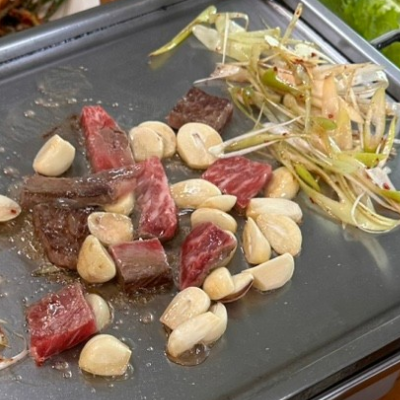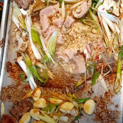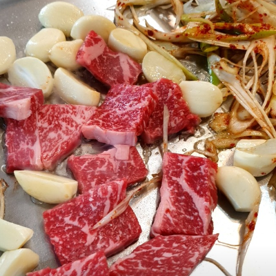 스태인레스 불판에는 마늘이 제일 먼저 올라가네요. 참기름을 살짝 두르고 마늘부터 굽기 시작합니다.