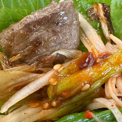 마늘 양념에 비벼져서 나온 양은 꼬들꼬들 마늘향이 납니다. 질기지 않고 넘나 꼬독하니 씹을수록 마늘향과 고소한 양구이맛입니다.
