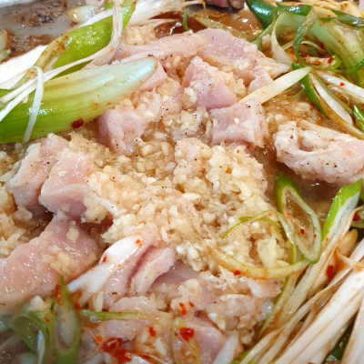 처음엔 마늘에 참기름 부어주시고 좀 있음 고기 그리고 파를 올려줍니다. 냄새 심하지 않고, 마늘하고 함께 먹으니 맛이 괜찮았어요.